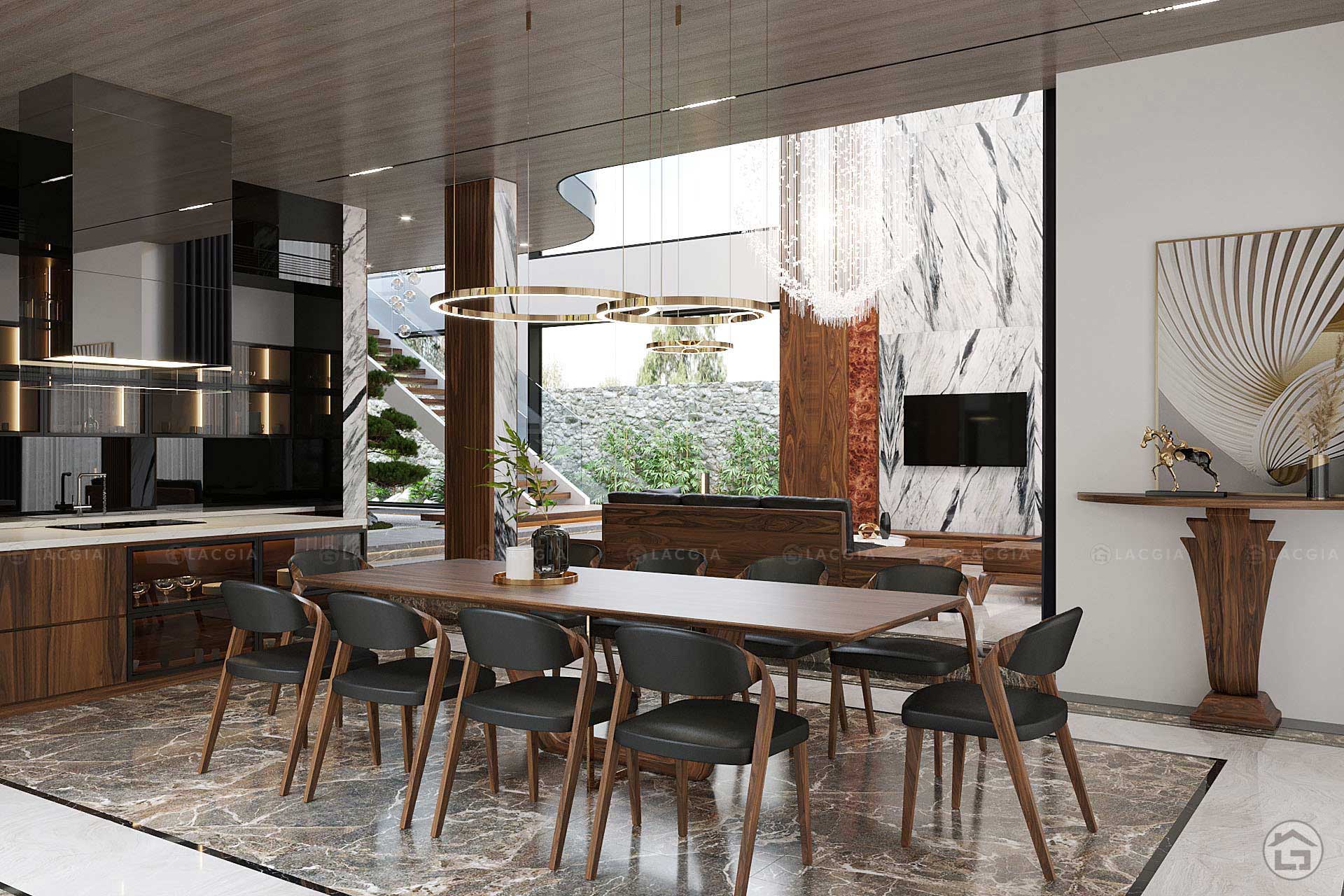 Căn biệt thự được bài trí những góc nội thất với chi tiết bo tròn tạo sự nổi bật đặc biệt cho chất liệu gỗ óc chó tự nhiên, sự hiện diện của BST DG Bespoke Đồng Gia mang đến.