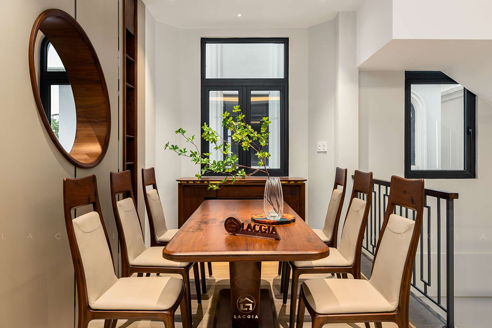 Căn biệt thự được bài trí những góc nội thất với chi tiết bo tròn tạo sự nổi bật đặc biệt cho chất liệu gỗ óc chó tự nhiên, sự hiện diện của BST DG Bespoke Đồng Gia mang đến.